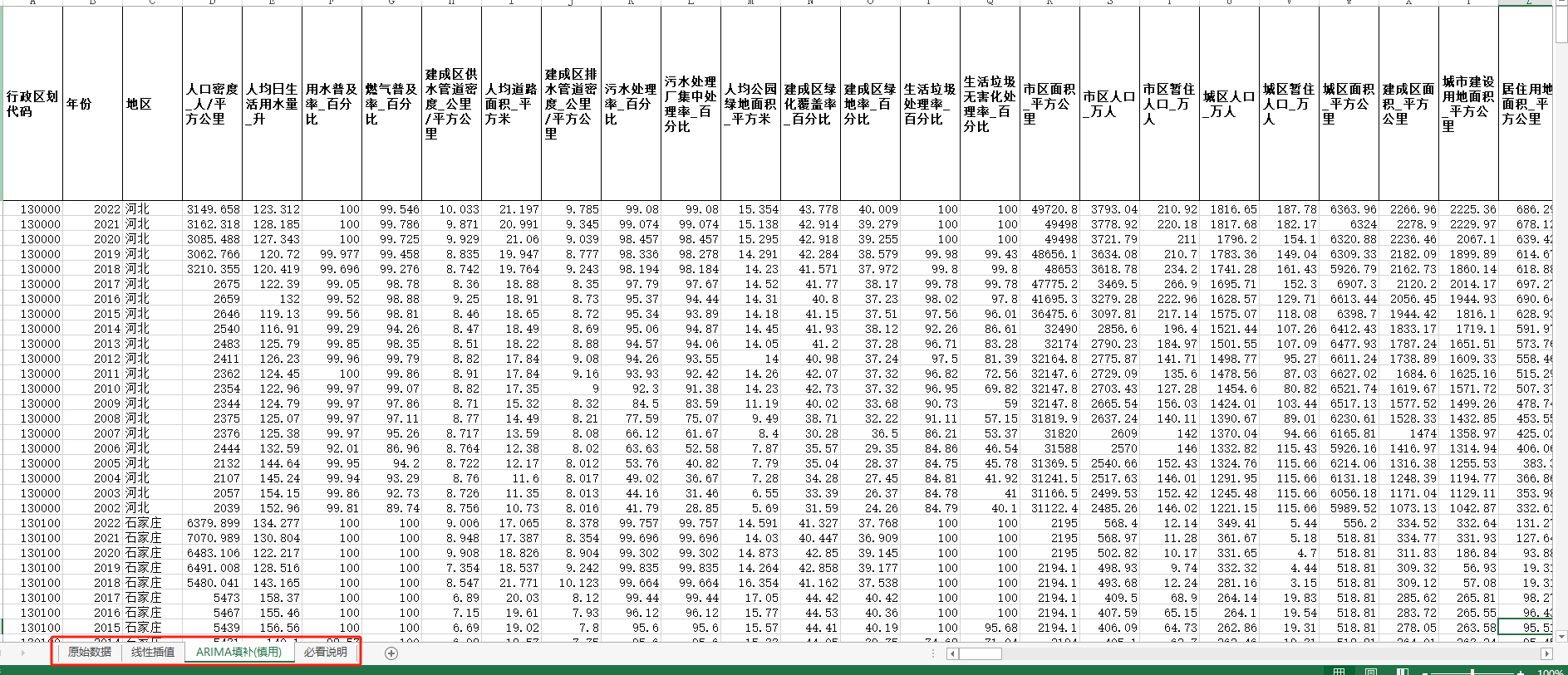 中国城市建设数据库(包含四个页签:原始数据、线性插值、ARIMA填补、有效值统计四个页签)本数据搜集整理了《中国城市统计年鉴》公布的历年数据,数据年度为2002-2022年。