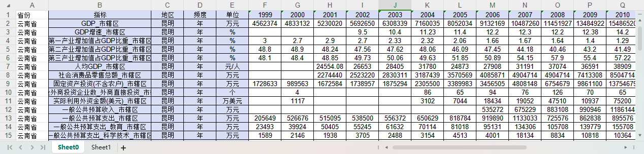 云南省各地级市市辖区1999-2022人均GDP建成区居住用地道路面积供用水燃气财政收支就业参保人数医疗卫生机构床位数等指标