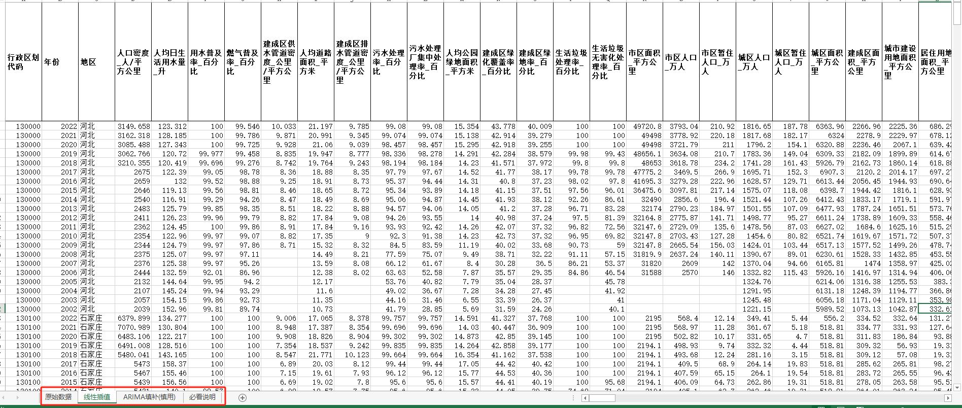 中国城市建设数据库(包含四个页签:原始数据、线性插值、ARIMA填补、有效值统计四个页签)本数据搜集整理了《中国城市统计年鉴》公布的历年数据,数据年度为2002-2022年。