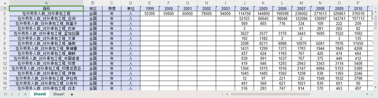 中国全国对外经济合作在外劳务人数细分全球世界各国1999-2022
