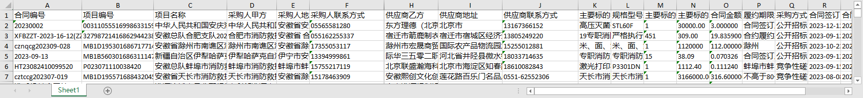 合同编号 项目编号 项目名称 采购人甲方 采购人地址 采购人联系方式 来源网站 供应商乙方 供应商地址 供应商联系方式 主要标的名称 规格型号或服务要求 主要标的数量 主要标的单价 合同金额万元 履约期限地点等简要信息 采购方式 合同签订日期 合同公告日期 其他补充事宜 所属地域 所属行业 代理机构 年份