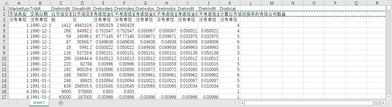 市场类型 交易日期 日市场交易总股数 日市场交易总金额 考虑现金红利再投资的日市场回报率(等权平均法) 不考虑现金红利再投资的日市场回报率(等权平均法) 考虑现金红利再投资的日市场回报率(流通市值加权平均法) 不考虑现金红利再投资的日市场回报率(流通市值加权平均法) 考虑现金红利再投资的日市场回报率(总市值加权平均法) 不考虑现金红利再投资的日市场回报率(总市值加权平均法) 计算日市场回报率的有效公司数量