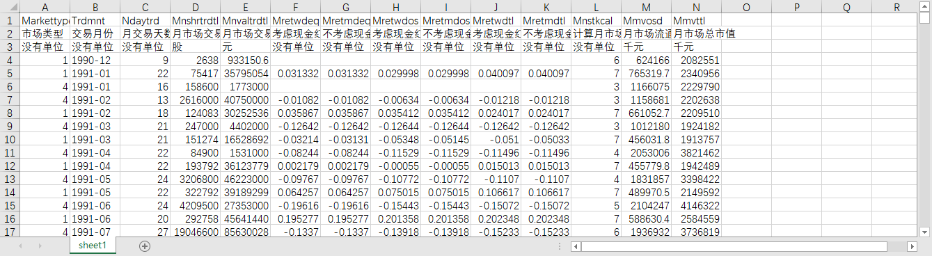 市场类型 交易月份 月交易天数 月市场交易总股数 月市场交易总金额 考虑现金红利再投资的月市场回报率(等权平均法) 不考虑现金红利再投资的月市场回报率(等权平均法) 考虑现金红利再投资的月市场回报率(流通市值加权平均法) 不考虑现金红利再投资的月市场回报率(流通市值加权平均法) 考虑现金红利再投资的月市场回报率(总市值加权平均法) 不考虑现金红利再投资的月市场回报率(总市值加权平均法) 计算月市场回报率的有效公司数量 月市场流通市值 月市场总市值