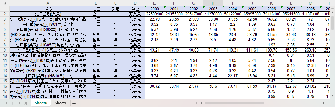 中国全国进口货物金额2000-2023细分HS章节01-99