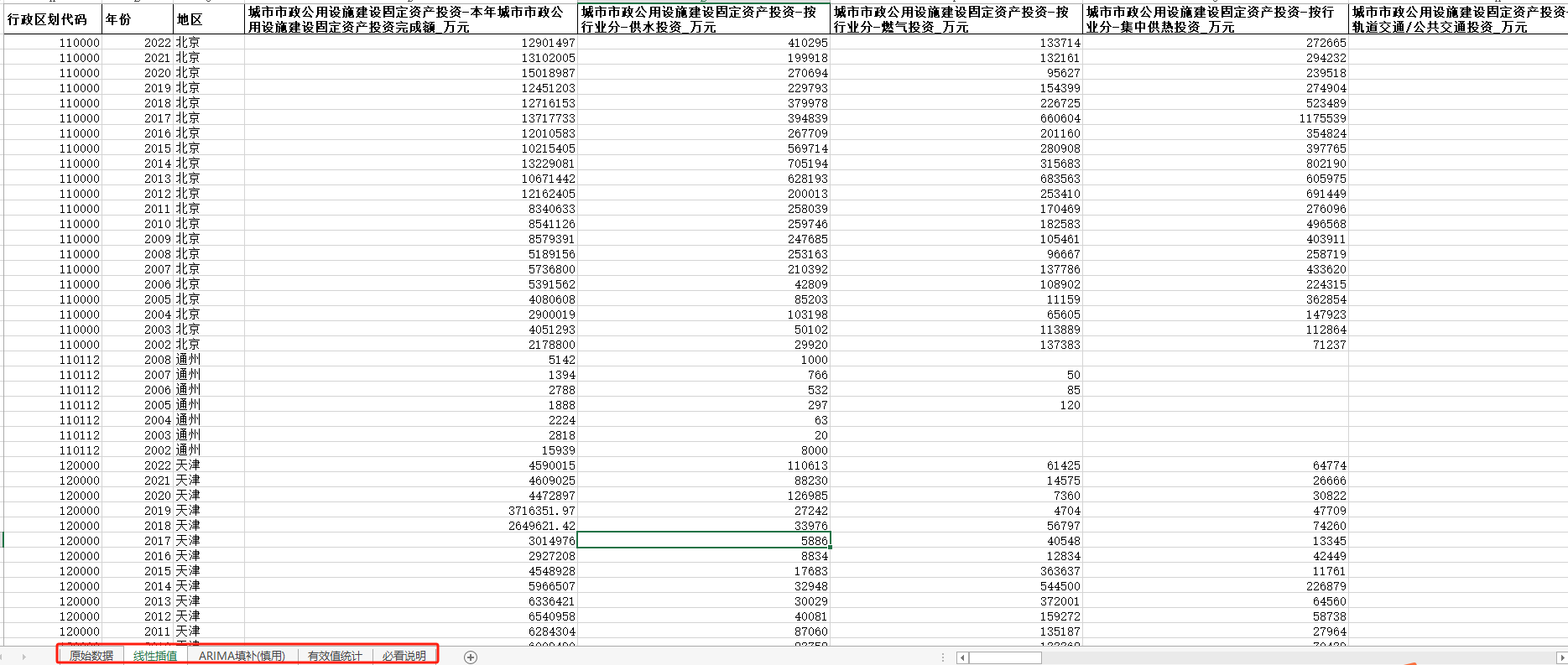 中国城市建设数据库(包含四个页签:原始数据、线性插值、ARIMA填补、有效值统计四个页签)本数据搜集整理了《中国城市统计年鉴》公布的历年数据,数据年度为2002-2022年。