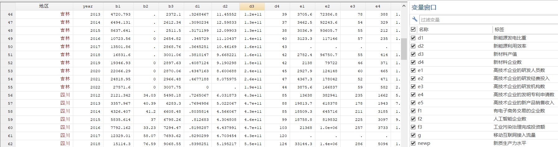 2.测算方式:参考顶刊《数量经济技术经济研究》韩文龙(2024)老师的研究做法,在上述分析基础上本文构建了新质生产力的测算指标体系对中国 2012~2022 年的新质生产力水平进行测算,具体指标见表 1下图所示。为保障测算结果真实可靠,本文剔除了变量缺失严重的个别省份,对各变量在部分年份的缺失值进行外插法插值处理。不同基础指标对新质生产力的影响权重不同,因而使用指标体系测算新质生产力水平时首先要确定赋权方法。目前相关学者主要使用主观赋权法和客观赋权法进行赋权,由于主观赋权法是根据赋权者主观判断对各指标赋予不同的权重,在实际操作中难以避免个人主观想法偏好的影响。因而,本文使用客观赋权法中的熵值法对各指标进行赋权:首先对各指标进行无量纲化处理,其次计算指标比重、信息熵的信息熵冗余度,然后计算指标权重,最后加权即求出总指数综合得分。