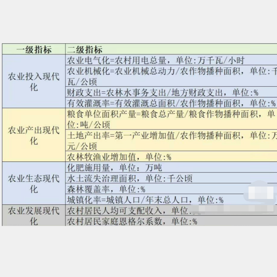 主要包括:农业投入现代化(4个二级指标)、农业产出现代化(3个二级指标)、农业生态现代化(3个二级指标)、农业发展现代化(3个二级指标)共计13个指标