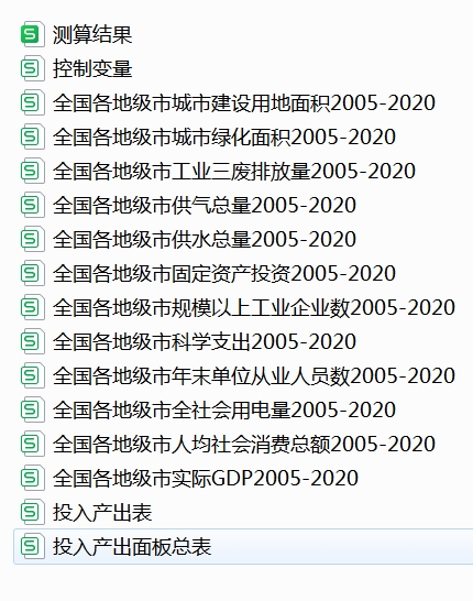 数据文件:地级市全要素生产率测算结果.csv;控制变量.csv;全国各地级市人均社会消费总额.csv; 全国各地级市供气总量.csv; 全国各地级市供水总量.csv; 全国各地级市全社会用电量.csv; 全国各地级市固定资产投资.csv; 全国各地级市城市建设用地面积.csv; 全国各地级市城市绿化面积.csv; 全国各地级市实际GDP.csv; 全国各地级市工业三废排放量.csv; 全国各地级市年末单位从业人员数.csv; 全国各地级市科学支出.csv; 全国各地级市规模以上工业企业数.csv; 投入产出表.csv; 投入产出面板总表.csv;