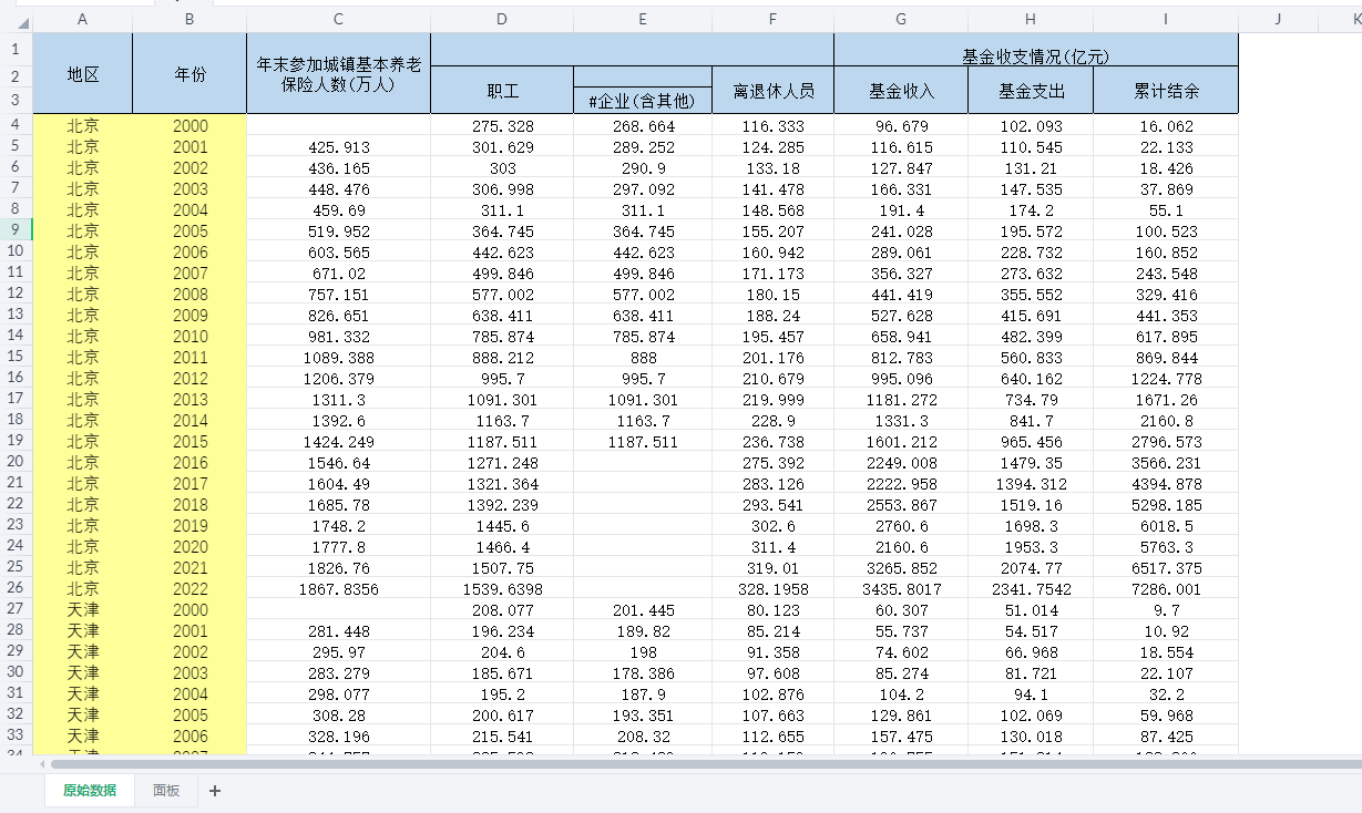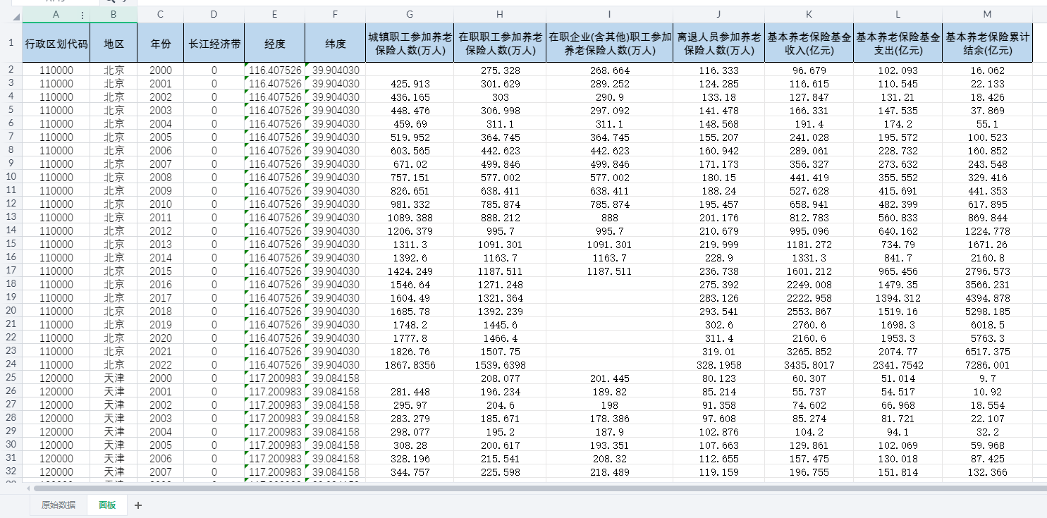 行政区划代码、地区、年份、长江经济带、经度、纬度、城镇职工参加养老保险人数(万人)、在职职工参加养老保险人数(万人)、在职企业(含其他)职工参加养老保险人数(万人)、离退人员参加养老保险人数(万人)、基本养老保险基金收入(亿元)、基本养老保险基金支出(亿元)、基本养老保险累计结余(亿元)。