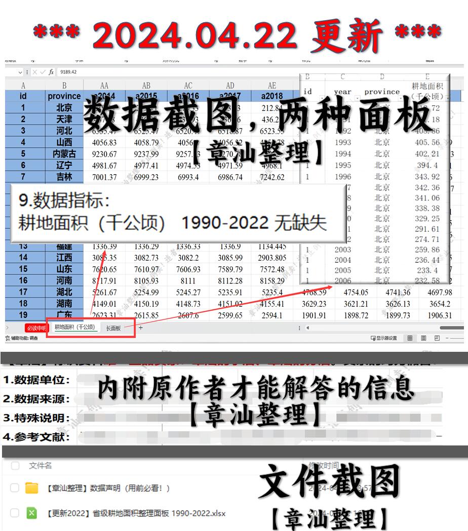 重磅更新!【章汕】已经开始更新2022年资料。可以持续关注!该资料整理了1990-2022省级耕地面积面板数据!整理成长面板和宽面板两种。100%真实性!来源有保障。对研究中做省级分析的朋友很有帮助。