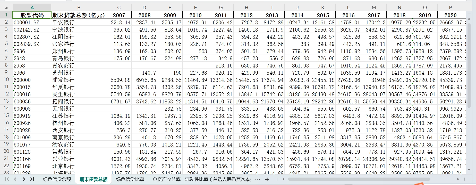商业银行绿色信贷指标说明:包括指标:绿色信贷余额期末、贷款总额、绿色信贷比率、总资产收益率、流动性比率、不良贷款率、拨备覆盖率、银行总资产、资本充足率、资产负债率、营收增长率、成本收入比、权益乘数2007-2021、存款总额、营业收入、基本每股收益