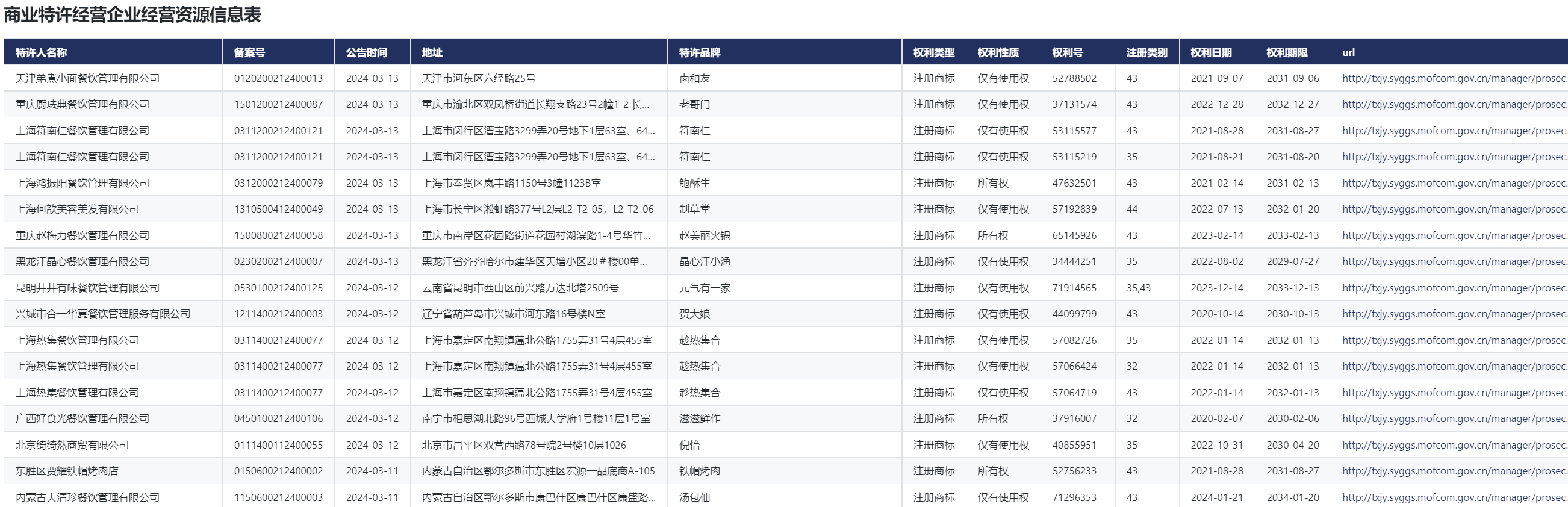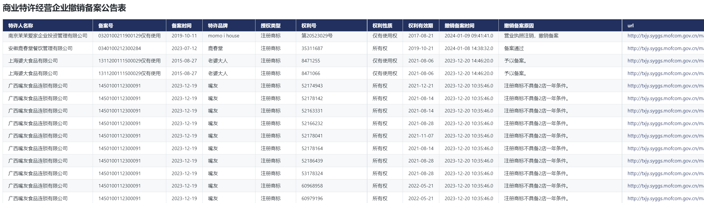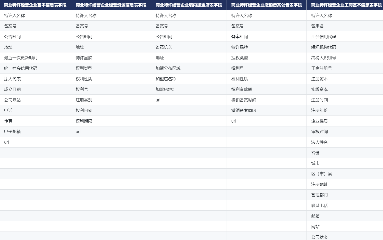 ,分为商业特许经营企业基本信息表、经营资源信息表、境内加盟店表、撤销备案公告表、工商基本信息表等五张表,包含特许人名称、备案号、公告时间、加盟店名称、撤销备案等字段。