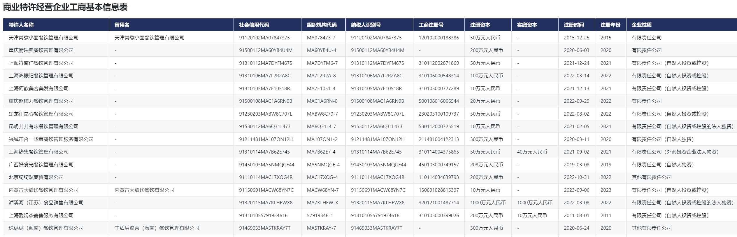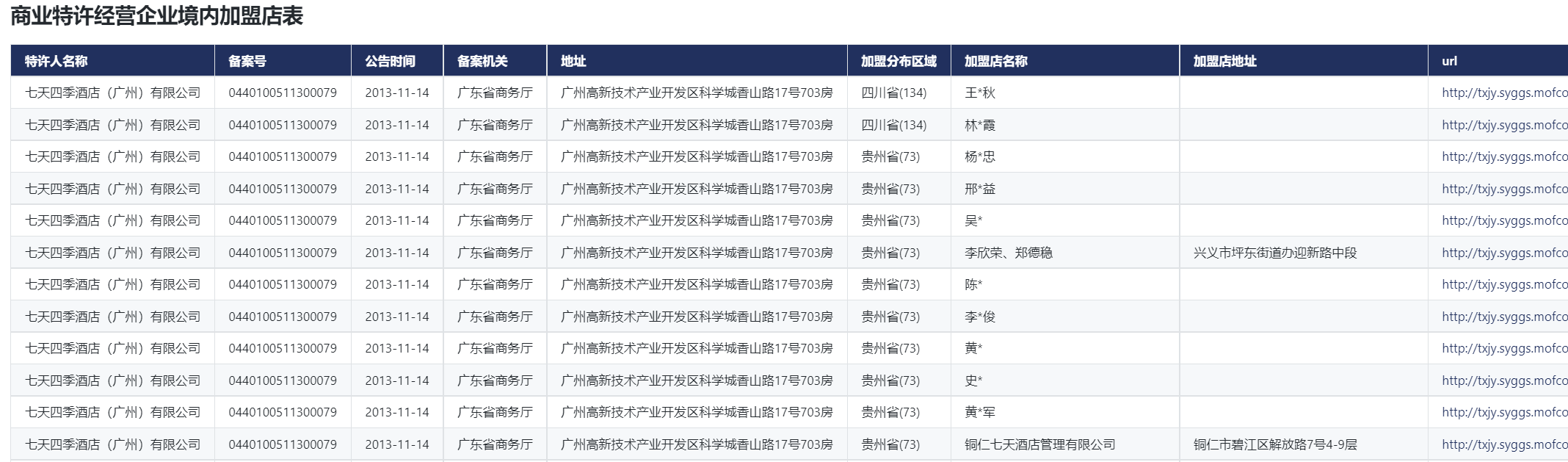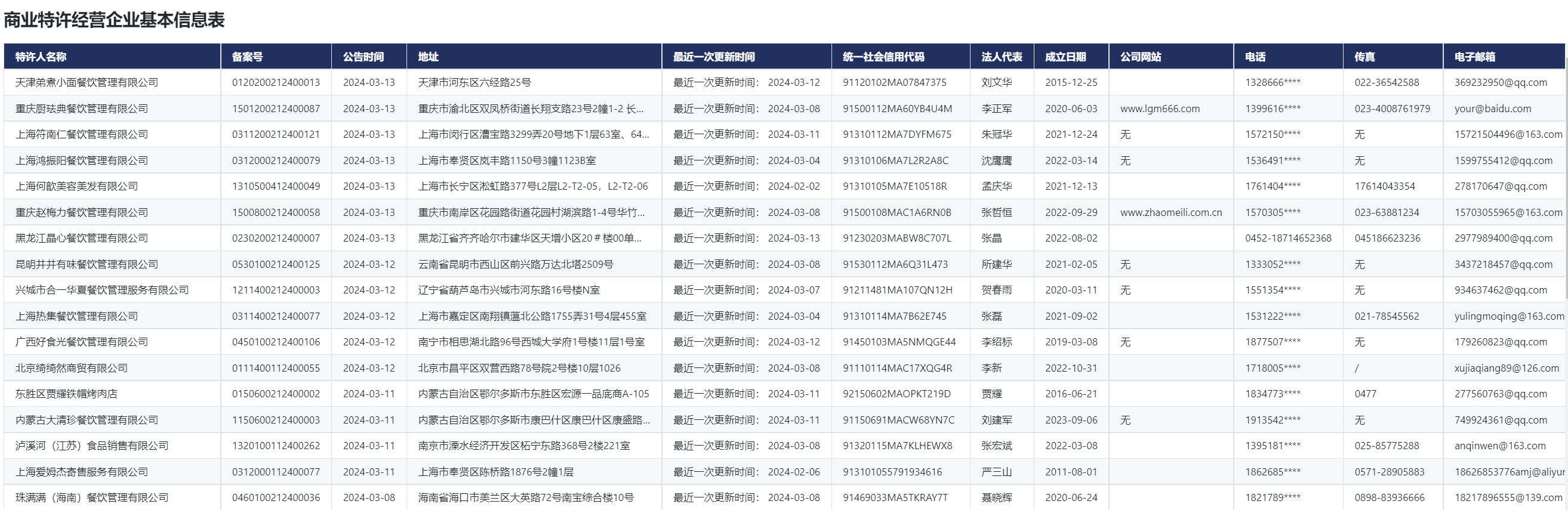 ,分为商业特许经营企业基本信息表、经营资源信息表、境内加盟店表、撤销备案公告表、工商基本信息表等五张表,包含特许人名称、备案号、公告时间、加盟店名称、撤销备案等字段。