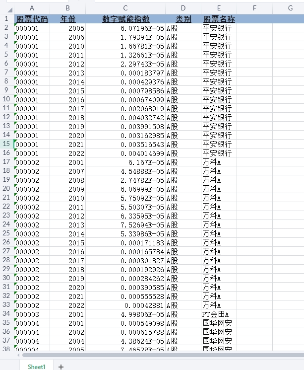 股票代码、年份、数字赋能指数、类别、股票名称。