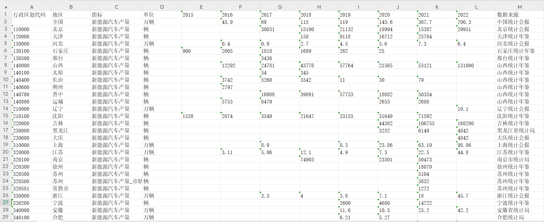 数据名称:中国各地区-新能源汽车产量(2015-2022年)
