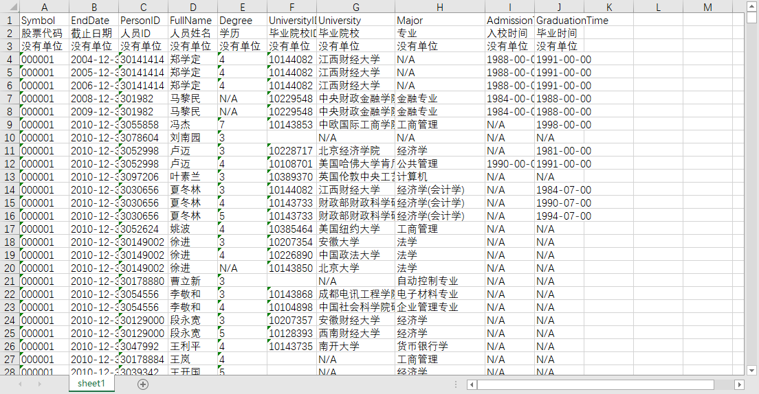 股票代码 截止日期 人员ID 人员姓名 学历 毕业院校ID 毕业院校 专业 入校时间 毕业时间