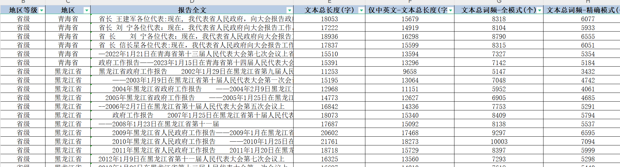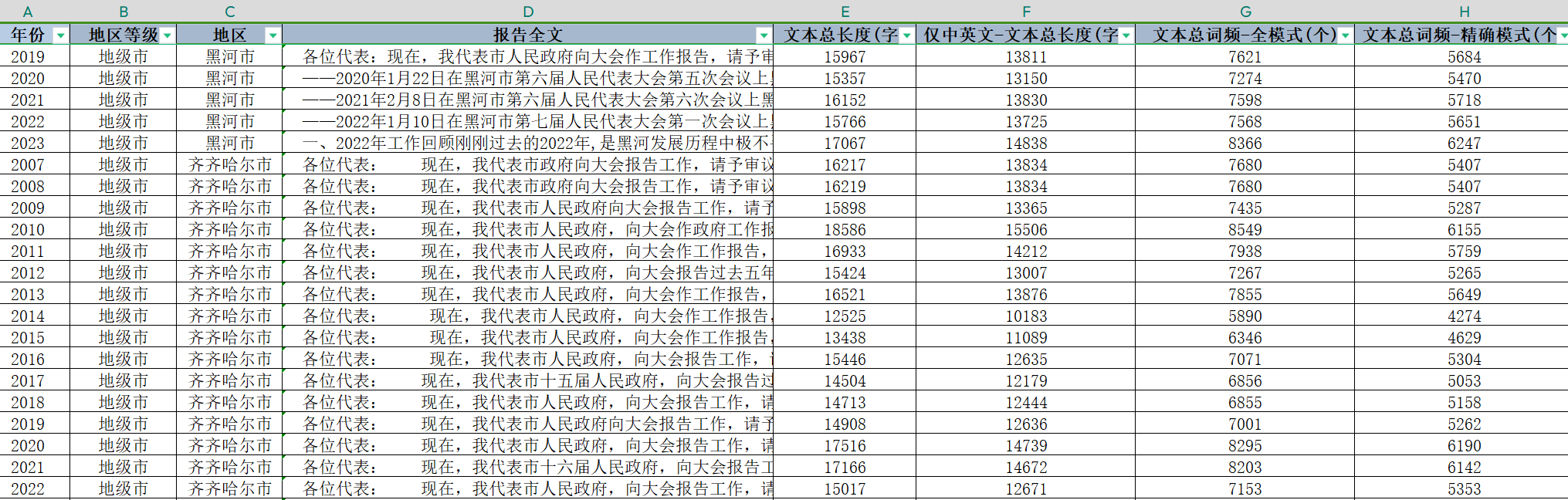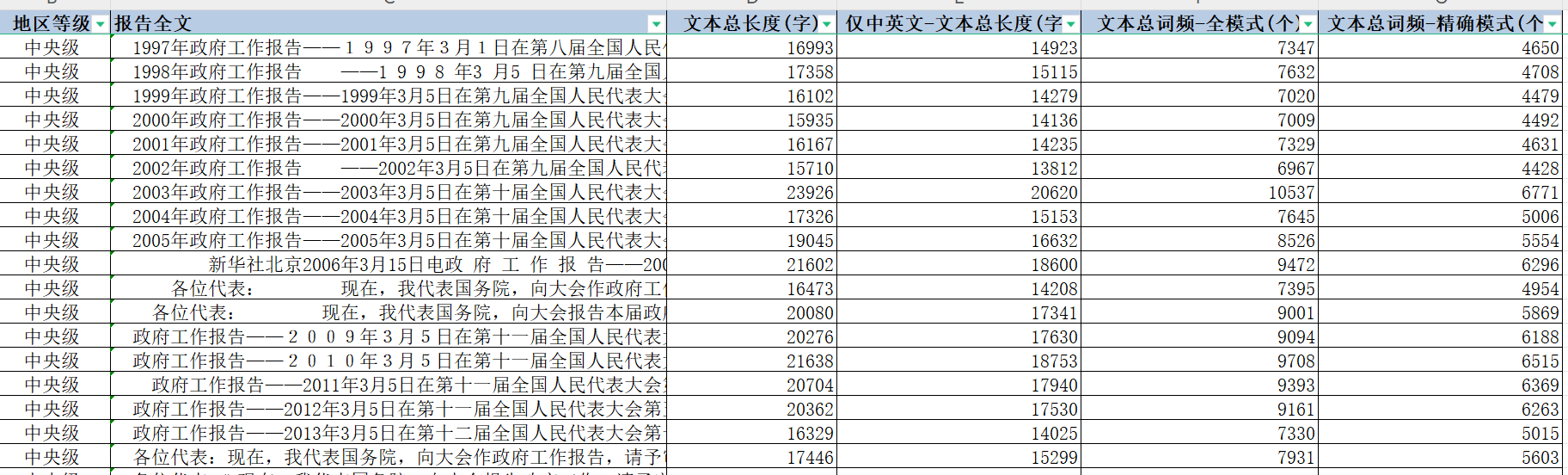 从地方政府网爬取工作报告原始文件,将报告文本整理为面板数据,去除停顿词,利用python的jieba库进行精确模式和全模式分词,统计词频和(包含精确模式和全模式),保留中英文、数字,统计全文文本总长度,保存原始文本、文本长度、词频总数