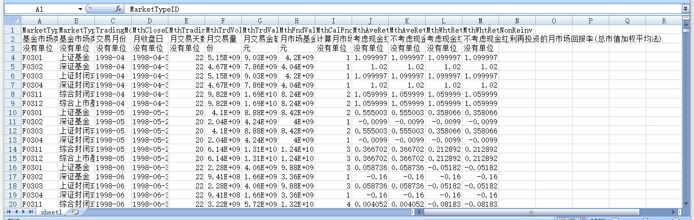 基金市场类型编码 基金市场类型 交易月份 月收盘日 月交易天数 月交易量 月交易金额 月市场基金总市值 计算月市场回报率的有效基金数量 考虑现金红利再投资的月市场回报率(等权平均法) 不考虑现金红利再投资的月市场回报率(等权平均法) 考虑现金红利再投资的月市场回报率(总市值加权平均法) 不考虑现金红利再投资的月市场回报率(总市值加权平均法)