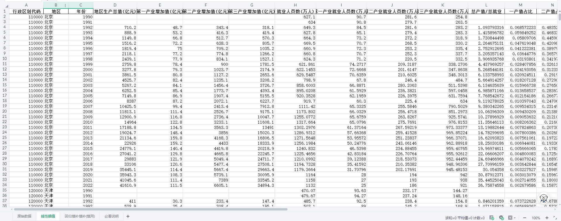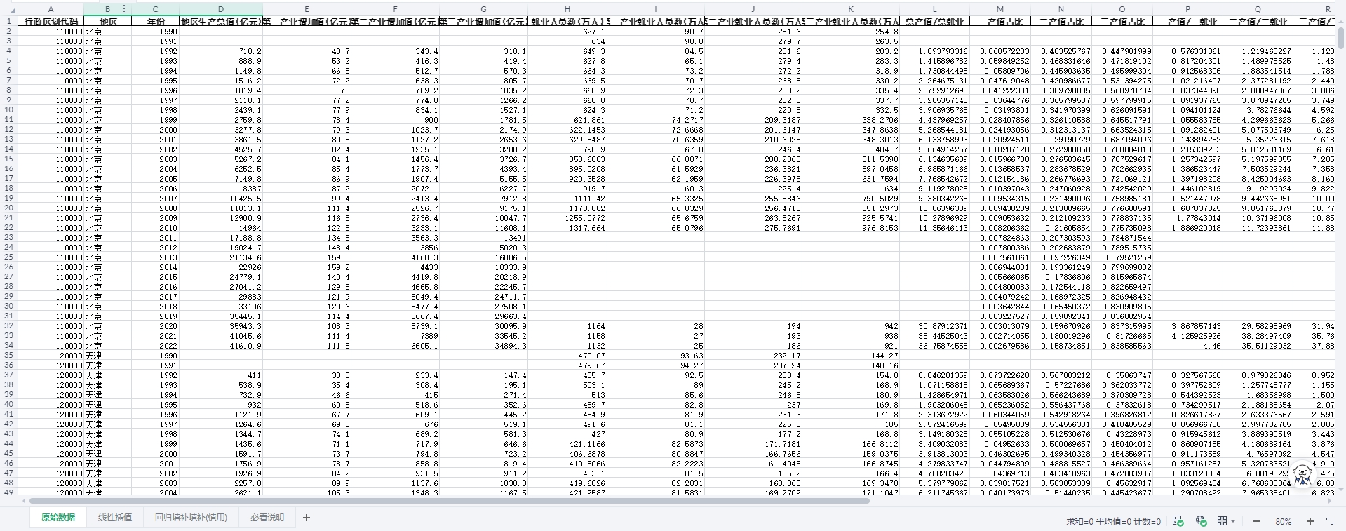 行政区划代码 | 地区 | 年份 | 地区生产总值(亿元) | 第一产业增加值(亿元) | 第二产业增加值(亿元) | 第三产业增加值(亿元) | 就业人员数(万人) | 第一产业就业人员数(万人) | 第二产业就业人员数(万人) | 第三产业就业人员数(万人) | 总产值/总就业 | 一产值占比 | 二产值占比 | 三产值占比 | 一产值/一就业 | 二产值/二就业 | 三产值/三就业 | (一产值/一就业) /(总产值/总就业) | (二产值/二就业) /(总产值/总就业) | (三产值/三就业) /(总产值/总就业) | 产业结构整体升级 | 产业结构合理化指数(泰尔) | 产业结构高级化指数 |