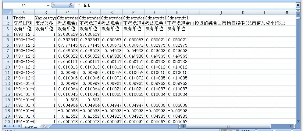 交易日期 市场类型 考虑现金再投资的综合日市场回报率(等权平均法) 不考虑现金再投资的综合日市场回报率(等权平均法) 考虑现金再投资的综合日市场回报率(流通市值加权平均法) 不考虑现金再投资的综合日市场回报率(流通市值加权平均法) 考虑现金再投资的综合日市场回报率(总市值加权平均法) 不考虑现金再投资的综合日市场回报率(总市值加权平均法)