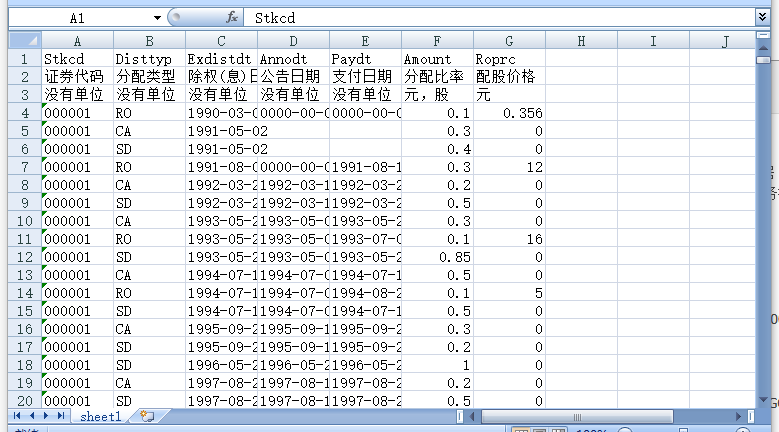 Disttyp [分配类型] - CA=现金红利,SD=送红股,RO=配股,DS=拆细,GQ=股权分置