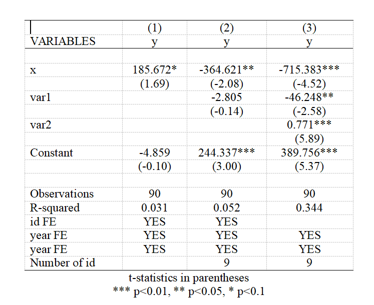 5. **固定效应的处理**:在双固定效应模型中,确保正确地控制了两个维度的固定效应可能很关键。使用`xtset`命令在Stata中设置面板数据结构,并使用`xtreg`命令进行固定效应回归分析,确保模型正确地控制了固定效应。