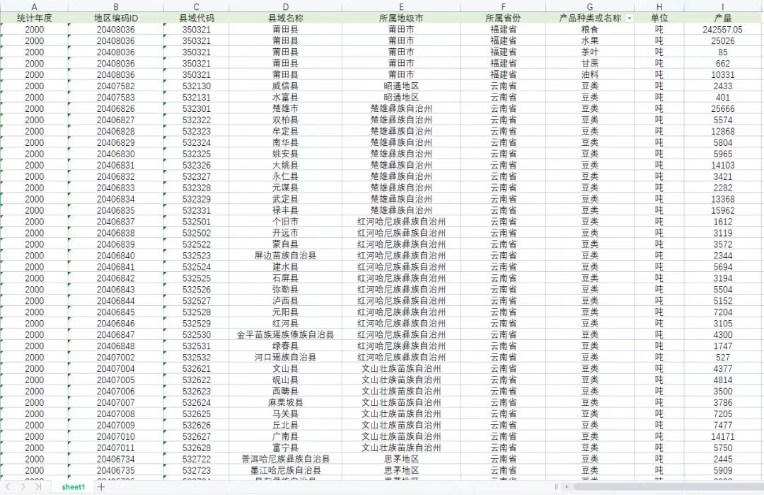 指标:县域代码、县域名称、所属地级市、所属省份、产品种类或名称、单位、产量