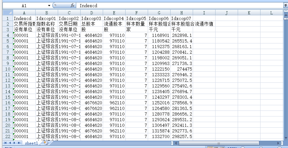 交易所指数代码 指数名称 交易日期 总股本 流通股本 样本数量 样本股组合总市值 样本股组合流通市值