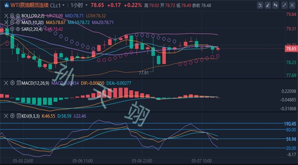 【原油消息面分析】:周二(5月7日)亚洲时段,美原油窄幅震荡,目前交投于78.90美元/桶。原油期货周一从100日均线附近反弹近1%,因哈马斯和以色列尚未达成停火协议,供给减少的担忧情绪有所升温。美原油周一上涨0.9%,美国原油期货结算价报每桶78.48美元;布伦特原油周一上涨1.03%,布伦特原油期货结算价报每桶83.33美元。两大合约上周均创下三个月来最大周线跌幅,布伦特原油期货下跌超过7%,美国原油期货下跌6.8%,投资者权衡疲软的美国就业数据和美联储可能降息的时机。原油,美原油,WTI布伦特原油,操作建议,行情分析,