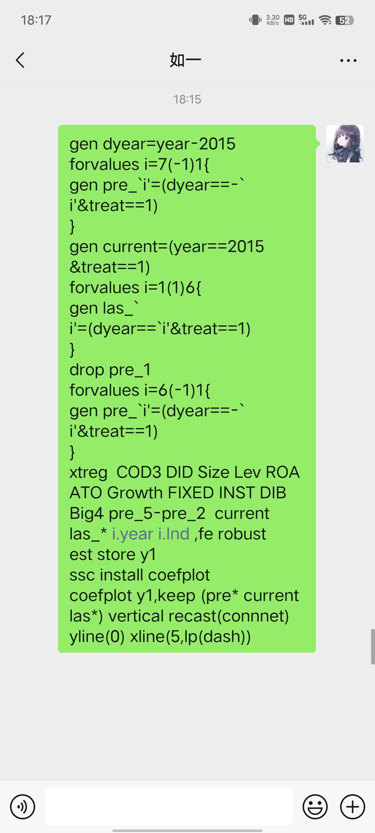 平行趋势检验的系数为正,但回归结果的影响是负的情况可能表明模型中存在其他未被考虑到的因素或者设定问题。你的命令看起来没有明显的错误,但是为了更准确地判断,你需要检查以下几个方面: