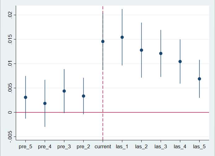4. 平行趋势假设:虽然系数为正,但回归结果负可能是平行趋势假设没有得到满足。你可以尝试通过视觉检查(如杜宾-福特沃斯图)来更直观地评估这个假设。