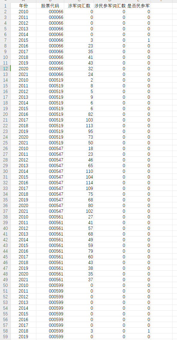 · 由于目前尚没有官方的涉军词库,根据倪宣明(2023)的研究,浏览了军工板块企业年报,得出了一些普遍使用的涉军词汇,并基于此构建涉军词库:军用、军工、军品、军事、军队、武装、军规、武器、国防、防务、强军、空军、海军、陆军、军种、兵种,共计16个词汇