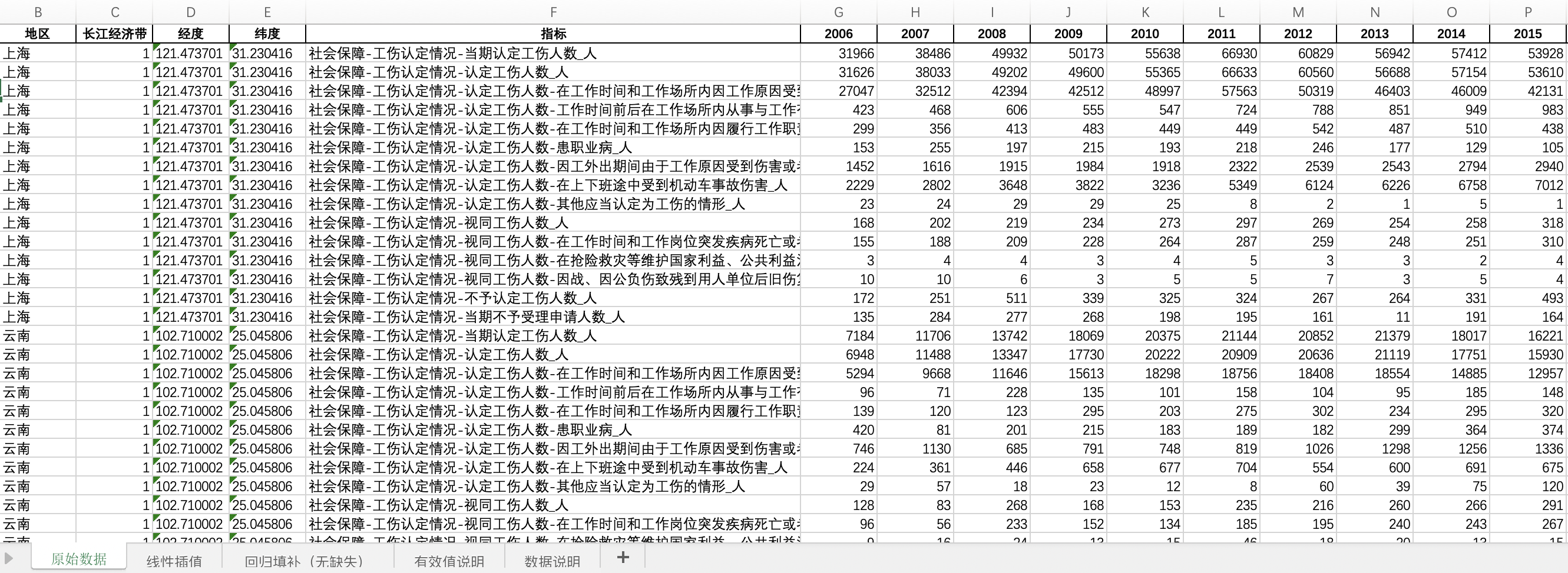 2022-2006全国31省份各省工伤认定情况认定工伤人数工伤申请人数职业病各类原因认定人数(插值填补无缺失版)