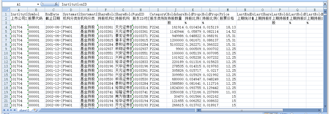 上市公司ID 股票代码 截止日期 机构分类编码 机构分类 持股机构ID 持股机构 股东ID对应的基金ID 股东类别编码 持股数量 持股比例(相对总股本) 持股比例(相对流通A股) 股票价格 上期统计截止日期 上期持股机构ID 上期持股数量 上期持股比例(相对总股本) 上期持股比例(相对流通A股) 上期股票价格 期间送转增配股比例 增减维持标识 行业代码 行业名称 数据来源