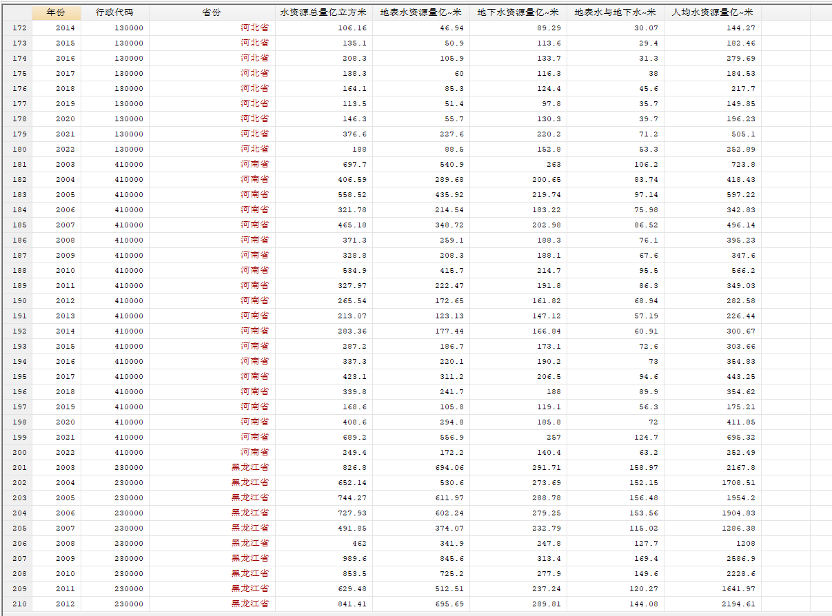 我们收集整理了一份2003-2022年全国31个省份及直辖市的水资源分类和利用数据