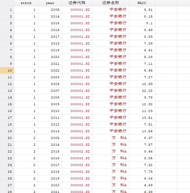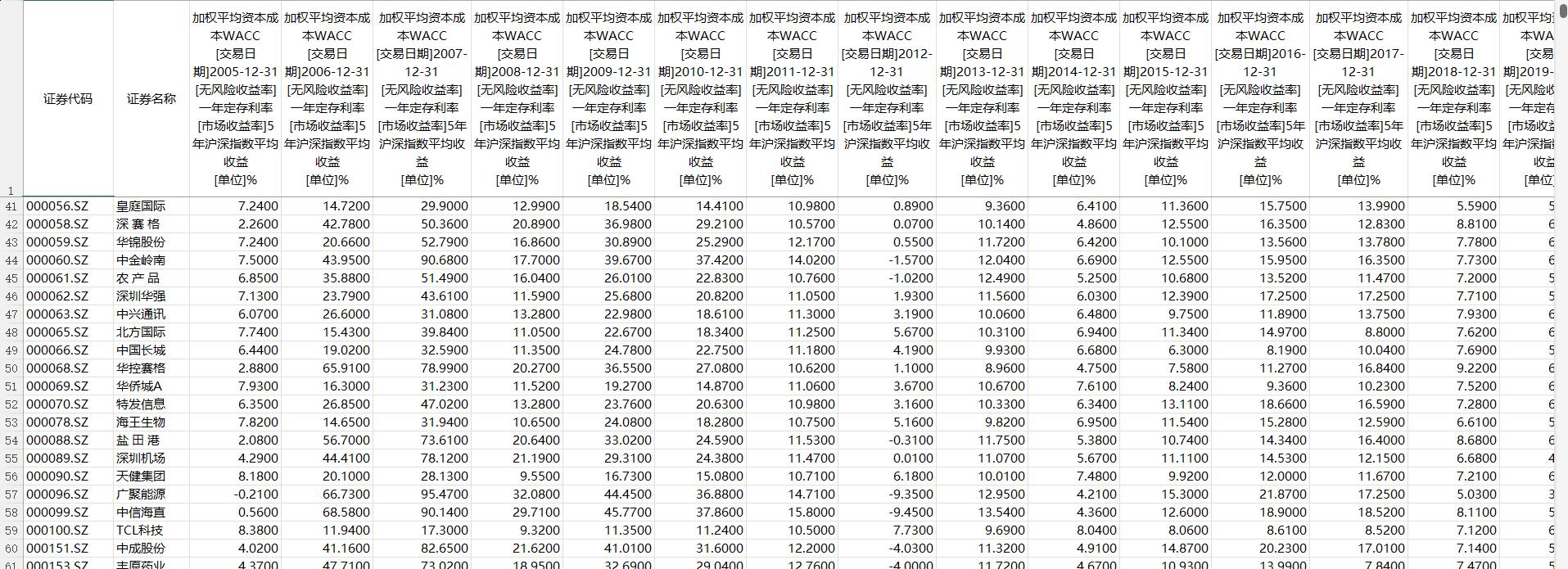 相关数据:证券代码、证券名称、加权平均资本成本WACC(2005-12-31~2023-12-31)。