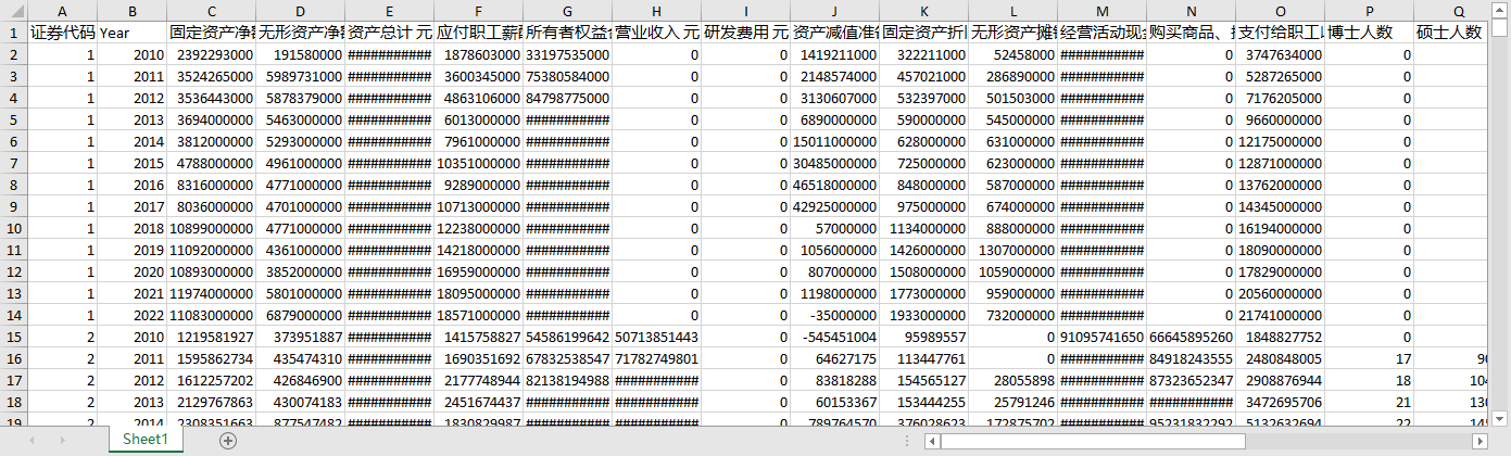 证券代码 没有单位 Year 固定资产净额 元 无形资产净额 元 资产总计 元 应付职工薪酬 元 所有者权益合计 元 营业收入 元 研发费用 元 资产减值准备 元 固定资产折旧、油气资产折耗、生产性生物资产折旧(元) 无形资产摊销 元 经营活动现金流入小计 元 购买商品、接受劳务支付的现金 元 支付给职工以及为职工支付的现金(元) 博士人数 硕士人数 本科人数 专科人数 高中及以下人数 其他学历人数 本期费用化研发支出[单位] 元 本期资本化研发支出[单位] 元 研发支出合计[单位] 元 研发支出总额占营业收入比例[单位] % 研发费用占营业收入比例[单位] % 研发人员数量 "研发人员数量占比