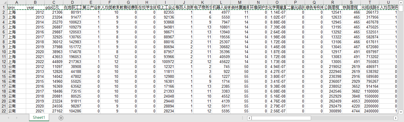 prov year gdp亿元 在岗职工工资元 第三产业就业比重 人均受教育平均年限 教育经费强度 在校学生结构 规上工业企业RD全时当量h 每百人创新企业数 电子商务交易活动企业数企业总数 机器人安装密度 森林覆盖率 环境保护支出一般财政支出 化学需氧量排放GDP 二氧化硫排放GDP 绿色专利申请数专利申请数 公路里程 铁路里程 光缆线路长度 人均互联网接入端口数 能源消耗量GDP 废气治理设施处理能力 专利授权数量总人口 新产品开发经费万元GDP 数字经济指数 企业数字化水平 新质生产力水平(熵值法) 互联网域名数 互联网接入端口数 互联网宽带接入用户数 移动基站密度 移动电话普及率 单位面积长途光缆长度 软件业务收入占GDP比重 信息技术服务收入占GDP比重 信息服务业从业人数 电信业务总量占GDP比重 电子商务交易活动企业比例 企业电子商务占GDP比重 企业每百人使用计算机数 每百家企业拥有网站数 数字普惠金融指数 规模以上工业企业RD人员折合全时当量人年 规模以上工业企业RD经费支出万元 规模以上工业企业RD项目课题数项 技术合同成交总额万元 专利申请授权数件 数字经济发展水平熵值法