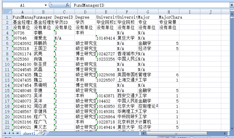 基金经理ID 基金经理姓名 学历ID 学历 毕业院校ID 毕业院校 专业 专业背景