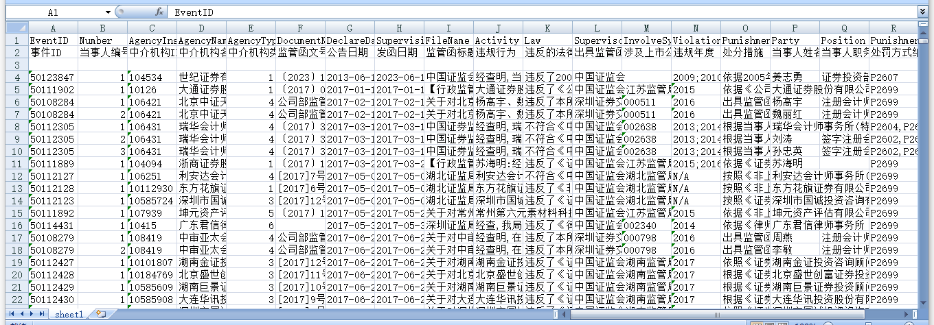 事件ID 当事人编号 中介机构ID 中介机构名称 中介机构类别 监管函文号 公告日期 发函日期 监管函标题 违规行为 违反的法律法规 出具监管函机构 涉及上市公司代码 违规年度 处分措施 当事人姓名 当事人职务 处罚方式编码 处罚方式