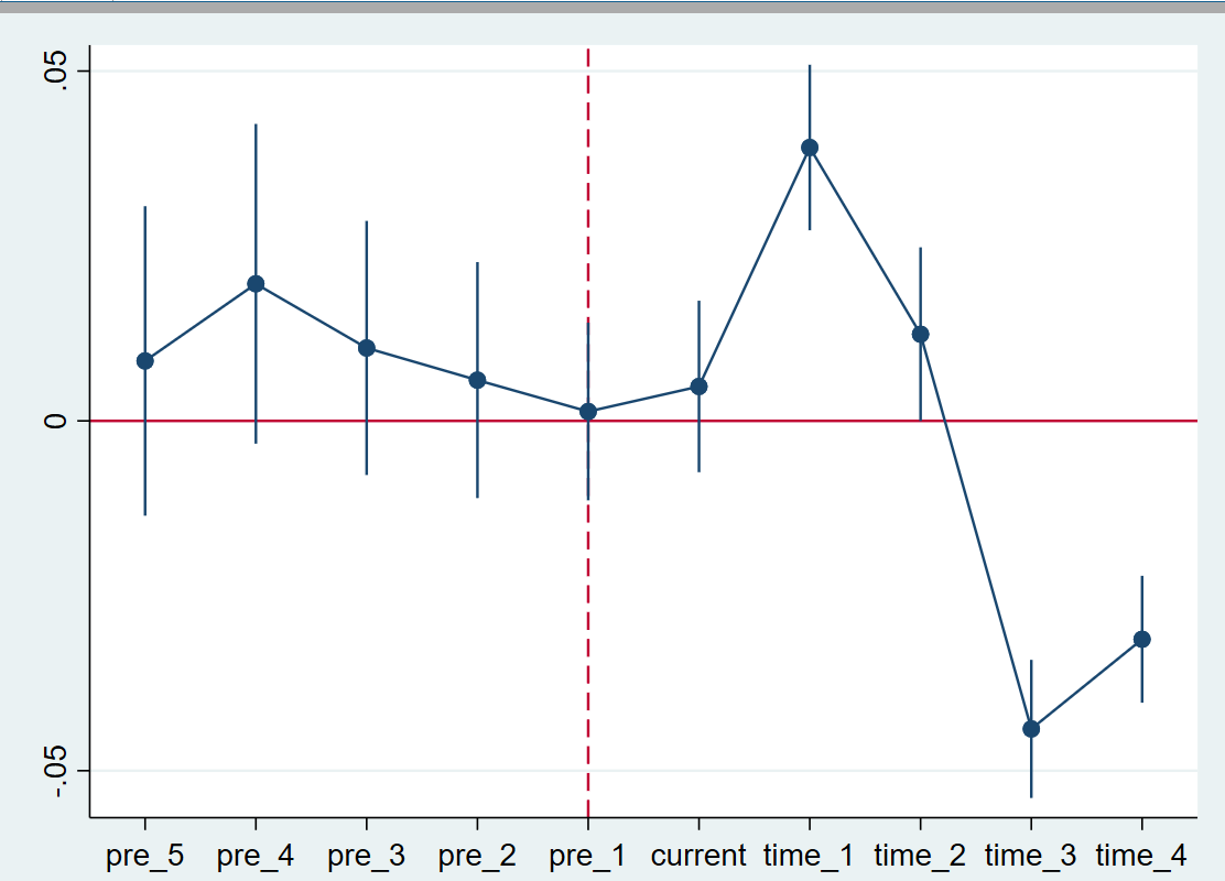 我来啦123 发表于 2024-5-10 20:07 基准回归是显著为负的,但是后1期、后2期都是显著为正的,请问这样的平行趋势是可以的吗?谢谢大家