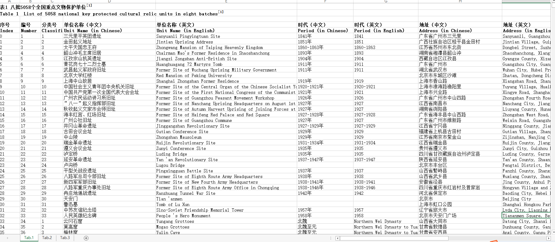 数据集内容包括:全国重点文物保护单位的名称、编号、分类号、时代、文物类别、批次和地址等信息。