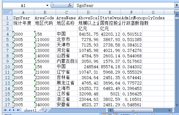 统计年度 地区代码 地区名称 规模以上企业营业收入 国有控股企业营业收入 行政垄断指数