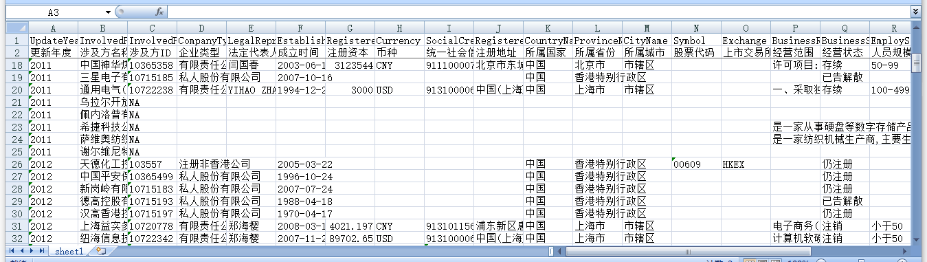 更新年度 涉及方名称 涉及方ID 企业类型 法定代表人 成立时间 注册资本 币种 统一社会信用代码 注册地址 所属国家 所属省份 所属城市 股票代码 上市交易所 经营范围 经营状态 人员规模 行业代码A 行业名称A 行业代码B 行业名称B 曾用名