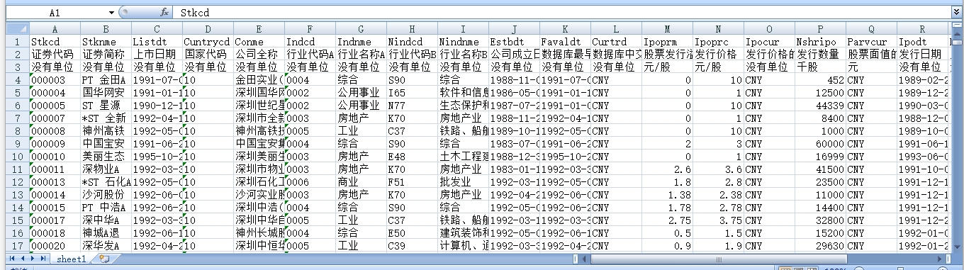 证券代码 证券简称 上市日期 国家代码 公司全称 行业代码A 行业名称A 行业代码B 行业名称B 公司成立日期 数据库最早交易记录的日期 数据库中交易数据的计量货币 股票发行溢价 发行价格 发行价格的计量货币 发行数量 股票面值的计量货币 发行日期 股票面值 区域码 公司活动情况 AB股交叉码 情况变动日 H股交叉码