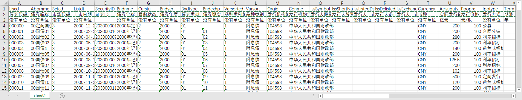 债券代码 债券简称 市场代码 上市日期 证券ID 债券全称 目前状态 债券年度 债券类型 债券期次 品种类别编码 品种类别 发行机构编码 发行机构全称 发行人股票代码 发行人股票简称 发行人上市日期 发行人退市日期 发行人上市场所 币种 实际发行量 发行价格 发行方式 期限 发行起始日期 到期日期 计息日期 止息日期 摘牌日期 付息方式编码 付息方式 计息方式编码 计息方式 年付息次数 票面利率 基准利率 基本利差 面值 信用等级 可赎回性 赎回条款 赎回日期 赎回价格 可回售性 回售条款 回售日期 回售价格 可调换性(目前国债没有该数据) 是否跨市场 跨市场说明 是否可分离 计息基础 第一次付息日 行权类型 看涨看跌 票面利率选择权开始周期 票面利率选择权浮动上限(%) 票面利率选择权浮动下限(%) 承销方式 发行对象 网上发行数量 网上发行认购数量限制说明 网上发行起始日期 网上发行截止日期 发行截止日期