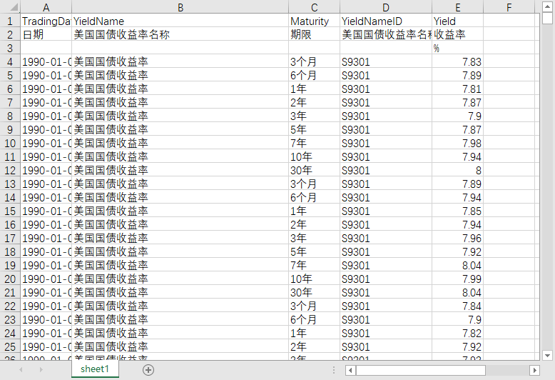 YieldNameID [美国国债收益率名称ID] - S9301:美国国债收益率;S9302:美国短期国库券利率(银行贴现);S9303:美国短期国库券利率(投资收益);S9304:美国长期国债收益率;S9305:美国国债实际收益率;S9306:美国国债长期平均实际利率