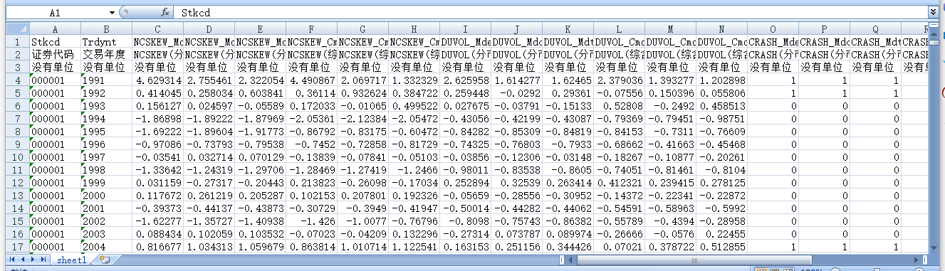 证券代码 交易年度 NCSKEW(分市场等权平均法) NCSKEW(分市场流通市值平均法) NCSKEW(分市场总市值平均法) NCSKEW(综合市场等权平均法) NCSKEW(综合市场流通市值平均法) NCSKEW(综合市场总市值平均法) DUVOL(分市场等权平均法) DUVOL(分市场流通市值平均法) DUVOL(分市场总市值平均法) DUVOL(综合市场等权平均法) DUVOL(综合市场流通市值平均法) DUVOL(综合市场总市值平均法) CRASH(分市场等权平均法) CRASH(分市场流通市值平均法) CRASH(分市场总市值平均法) CRASH(综合市场等权平均法) CRASH(综合市场流通市值平均法) CRASH(综合市场总市值平均法) 交易周数 市场类型 行业代码 交易状态