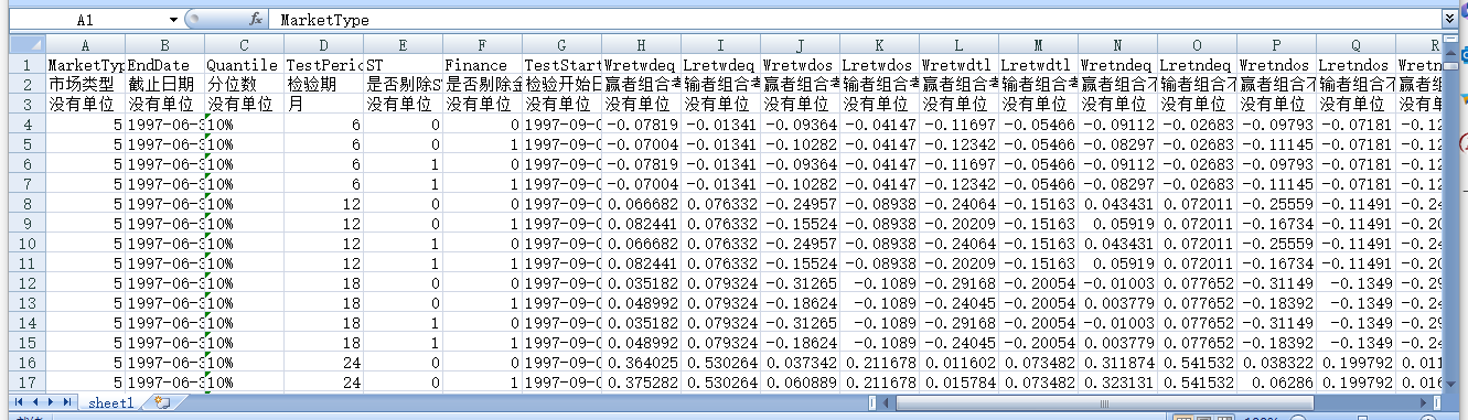市场类型 截止日期 分位数 检验期 是否剔除ST股 是否剔除金融股 检验开始日期 赢者组合考虑现金红利再投资回报率(等权平均法) 输者组合考虑现金红利再投资回报率(等权平均法) 赢者组合考虑现金红利再投资回报率(流通市值平均法) 输者组合考虑现金红利再投资回报率(流通市值平均法) 赢者组合考虑现金红利再投资回报率(总市值平均法) 输者组合考虑现金红利再投资回报率(总市值平均法) 赢者组合不考虑现金红利再投资回报率(等权平均法) 输者组合不考虑现金红利再投资回报率(等权平均法) 赢者组合不考虑现金红利再投资回报率(流通市值平均法) 输者组合不考虑现金红利再投资回报率(流通市值平均法) 赢者组合不考虑现金红利再投资回报率(总市值平均法) 输者组合不考虑现金红利再投资回报率(总市值平均法) 赢者组合股票个数 输者组合股票个数