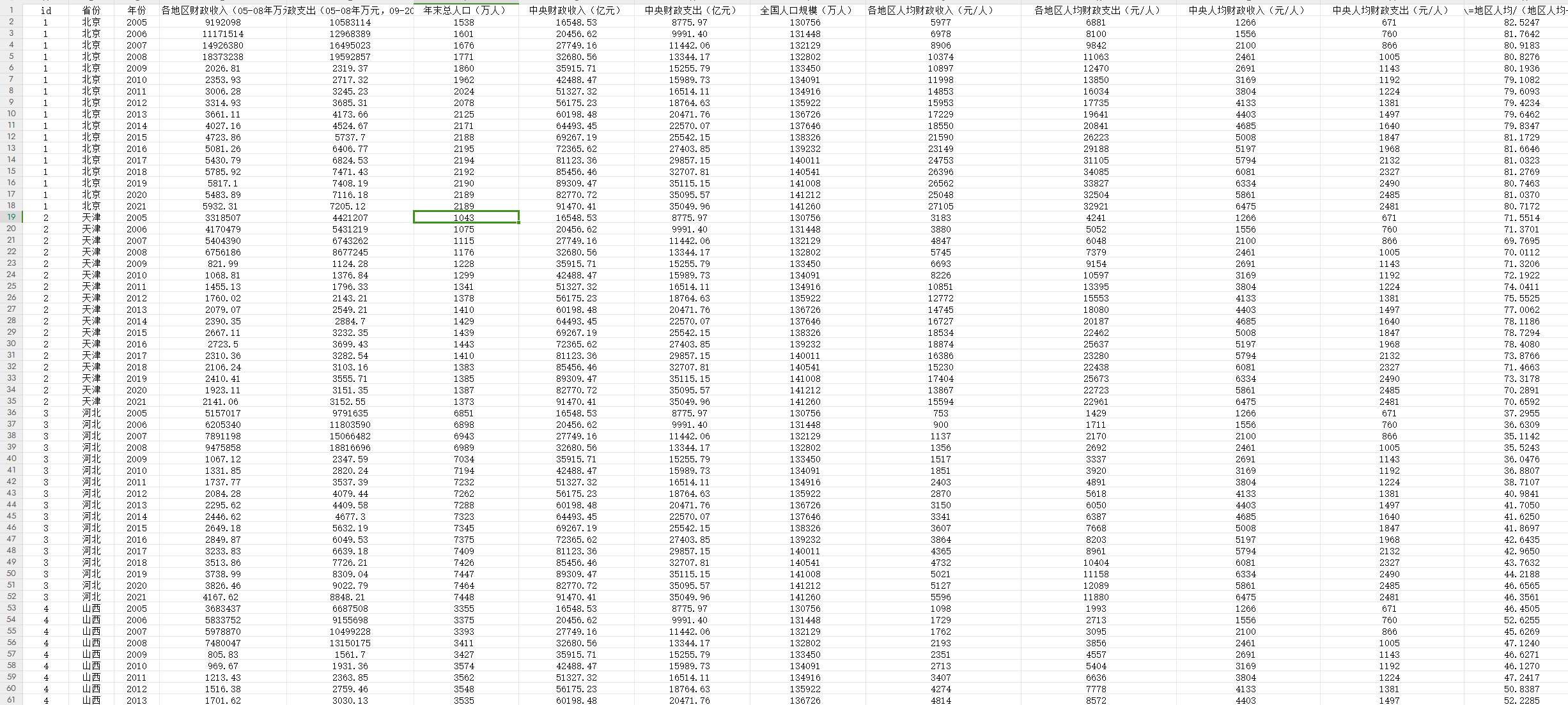 3.数据指标:财政分权(收入.支出)都有,内含中央人均财政收入,中央人均财政支出,各地区人均财政收入 支出,具体为id 省份 年份 各地区财政收入(05-08年万元,09-20年亿元) 各地区财政支出(05-08年万元,09-20年亿元) 年末总人口(万人) 中央财政收入(亿元) 中央财政支出(亿元) 全国人口规模(万人) 各地区人均财政收入(元/人) 各地区人均财政支出(元/人) 中央人均财政收入(元/人) 中央人均财政支出(元/人) 财政分权(收入=地区人均/(地区人均+中央人均)*100) 财政分权(支出=地方人均/(地方人均+中央人均)*100) 财政分权(支出=地区人均/中央人均) 财政分权(收入=地区人均/中央人均)